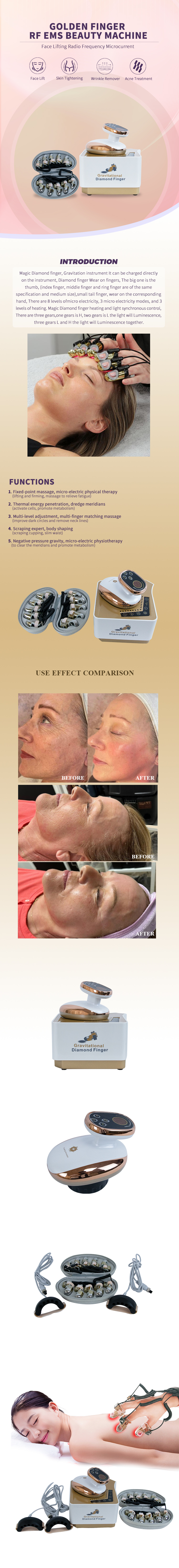 Magic Diamond finger, Gravitation instrument It can be charged directly on the instrument, Diamond finger Wear on fingers, The big one is the thumb, (index finger, middle finger and ring finger are of the same specification and medium size), small tail finger, wear on the corresponding hand, There are 8 levels of micro electricity, 3 micro electricity modes, and 3 levels of heating. Magic Diamond finger heating and light synchronous control, There are three gears,one gears is H, two gears is L the light will Luminescence, three gears L and H the light will Luminescence together.