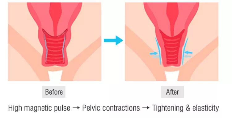 Using electromagnetic pulses to stimulate motor neurons to control the pelvic floor muscles, causing the pelvic floor muscles to hyper-contract (12,000 pelvic floor muscle contractions). Activate pelvic floor tissue, promote collagen regeneration, restore firmness, enhance elasticity, comprehensively repair loose muscles, and stay away from pelvic floor dysfunction diseases.